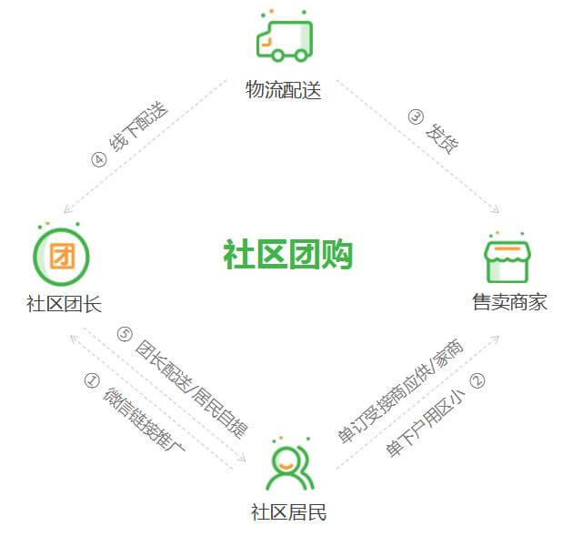 社区社群团购,以社区为中心,以团长为分发 节点,社区居民通过微信群,小程序等工具团购水果生鲜、日化美妆等。平台根据 订单发货至团长,最终用户线下自提或团长配送从而完成购物流程,团长既是小区 里的销售者,也是购买者,一般为社区小店店主等。社区团购基于真实地理位置上近的社区进 行,是基于信任和情感建立的购物场景。